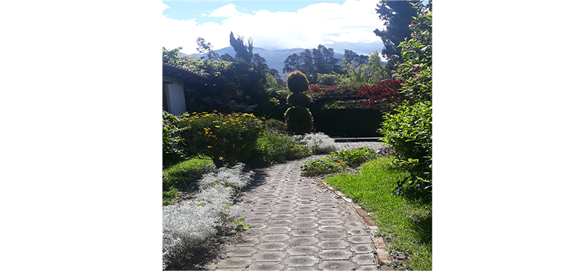 House #6 is on a generous-sized corner lot which allows for partial fencing for pets and large unfenced area for the garden surrounding the house. In the back yard there is a lovely brick patio ( with beautiful views of the Cotacachi Volcano) extending from the back door of the house to the bar-b-que outdoor pavilion which has a Spanish tile roof covered in bright bugambilia and cubicles below for storage and pet shelter in case of a sudden rain or outdoor nighttime sleeping.