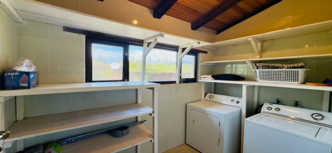 The completely-tiled, corner kitchen has double views, all American appliances ( Frigidaire dishwasher,etc.). There is a separate, tiled laundry room / pantry off the kitchen which has a Whirlpool washer and dryer.